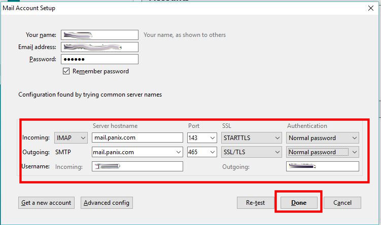 On the next window, Thunderbird will detect and display the server settings (this requires that you be online). It will do so incorrectly, so click on "Manual config".